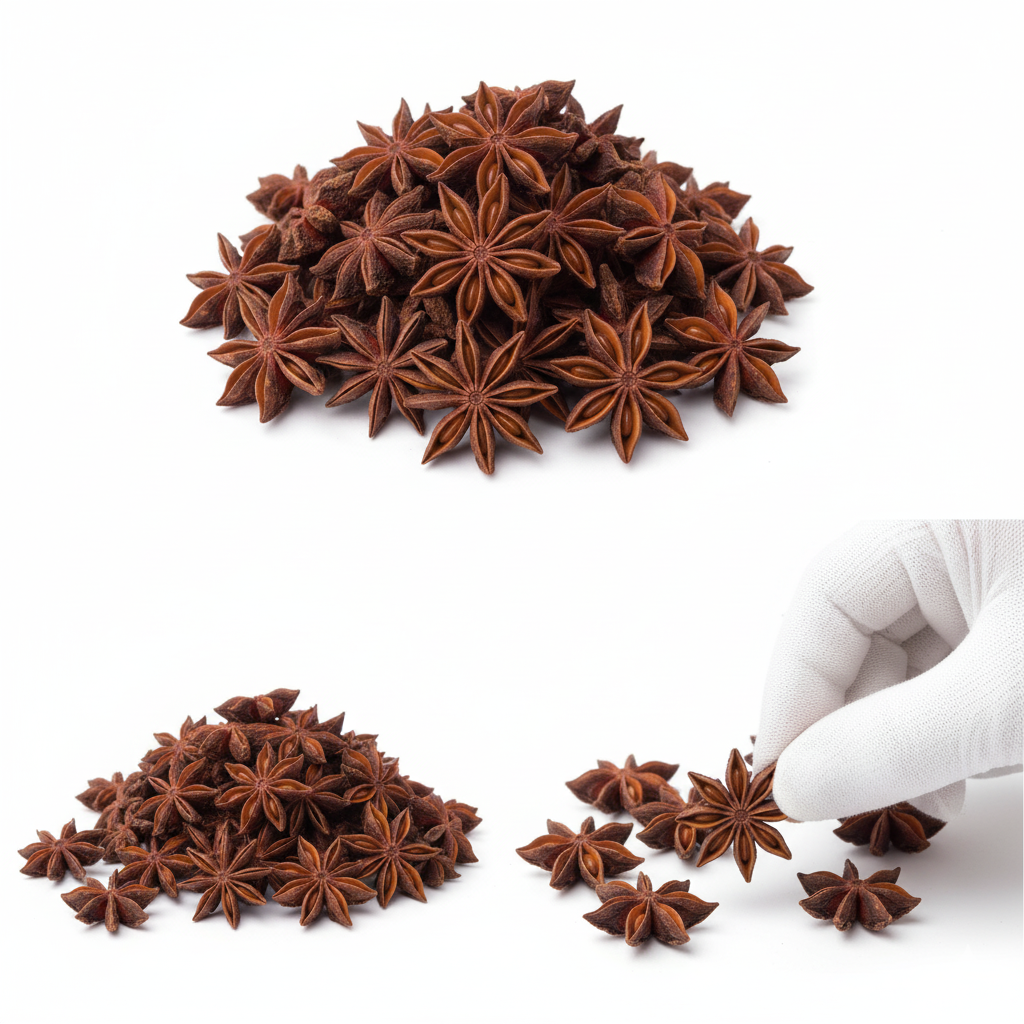 Whole star pods, reddish-brown color, strong aroma