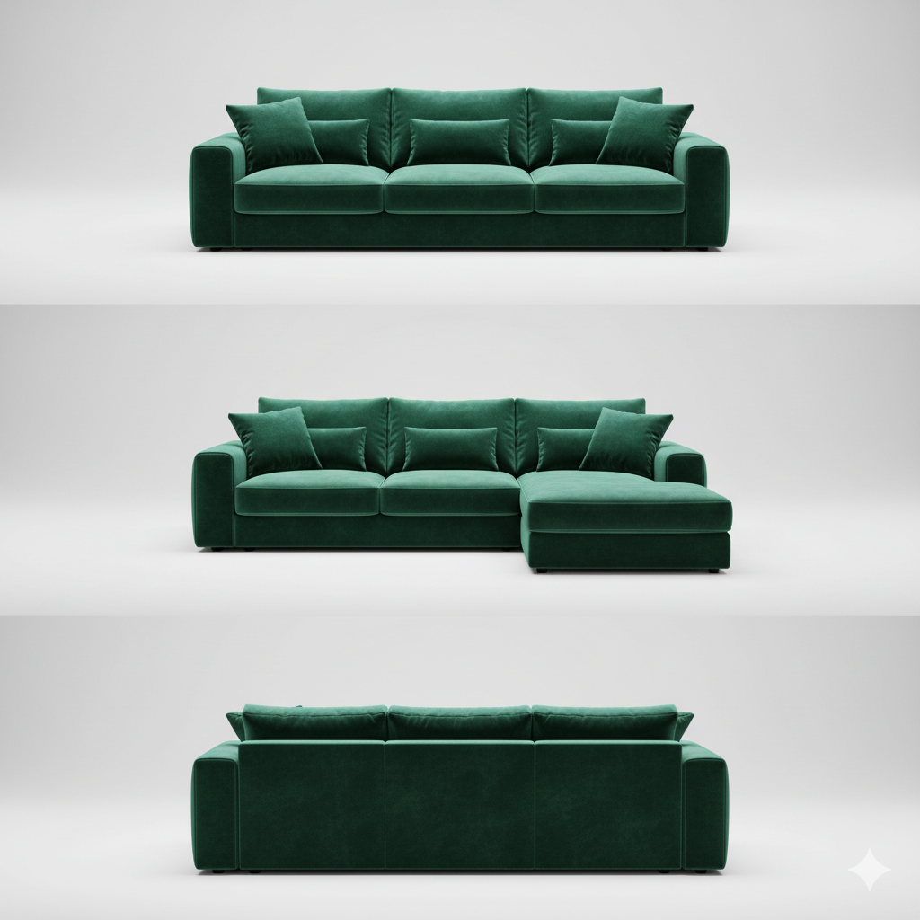 Modular pieces, deep emerald velvet, low-profile design